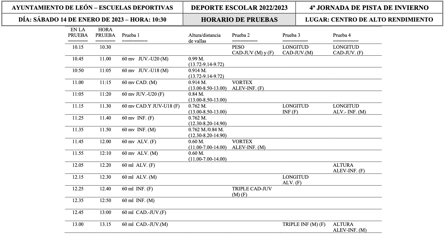 El sábado 14 de enero de 2023 a partir de las 10:30 horas en las instalaciones del Centro de Alto Rendimiento en León se celebró la 4ª Jornada de Atletismo Escolar Pista Cubierta.