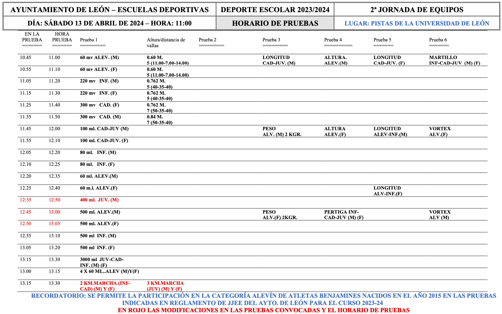 El sábado 13 de abril de 2024 a partir de las 11:00 horas en las Pistas de Atletismo de la Universidad de León se celebró la 2ª Jornada Escolar Atletismo Aire libre de Equipos.