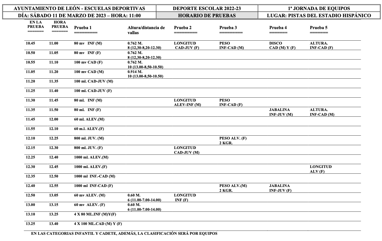 El sábado 11 de marzo de 2023 en las instalaciones del Estadio Hispánico de León se celebrará la 4ª Jornada de Atletismo Escolar Aire Libre.