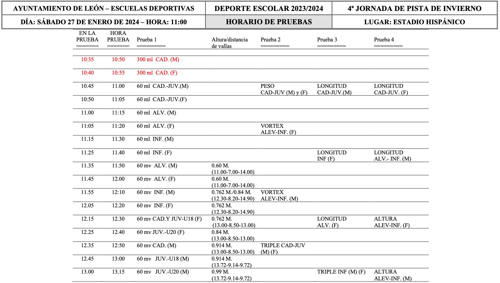 El sábado 27 de Enero de 2024 a partir de las 10:30 horas en las instalaciones del Estadio Hispánico de León se celebrará la 3ª Jornada Pista Invierno y un Control Provincial de la prueba de 500m para las categorías Sub12 y Sub14.