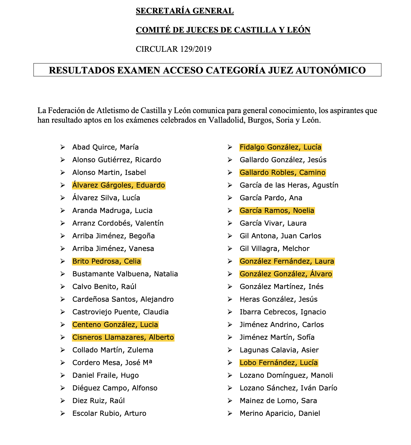 Seguidamente os dejamos el listado de la Federación de Atletismo de Castilla y León para general conocimiento, de los aspirantes que han resultado aptos en los exámenes celebrados en Valladolid, Burgos, Soria y León para acceso a jueces autonómicos y os destacamos los que han aprobado de León.