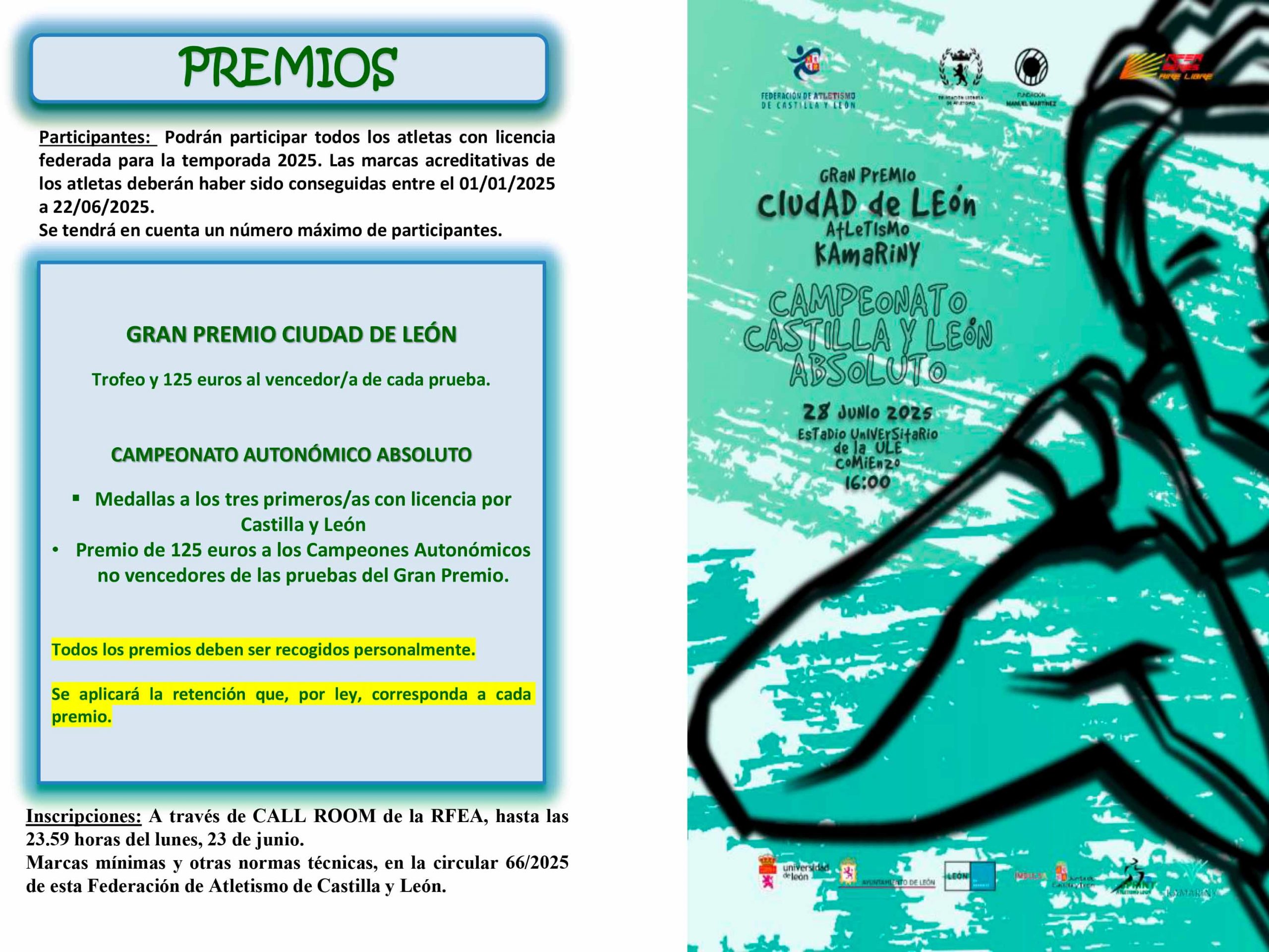 La Federación de Atletismo de Castilla y León, la Delegación Leonesa de Atletismo y la Fundación Manuel Martínez organizan el Campeonato Autonómico Absoluto, la jornada Gran Premio Ciudad de León con el patrocinio de la tienda de Deportes Kamariny- el Excmo Ayuntamiento de León y la Universidad de León y un control de marcas.