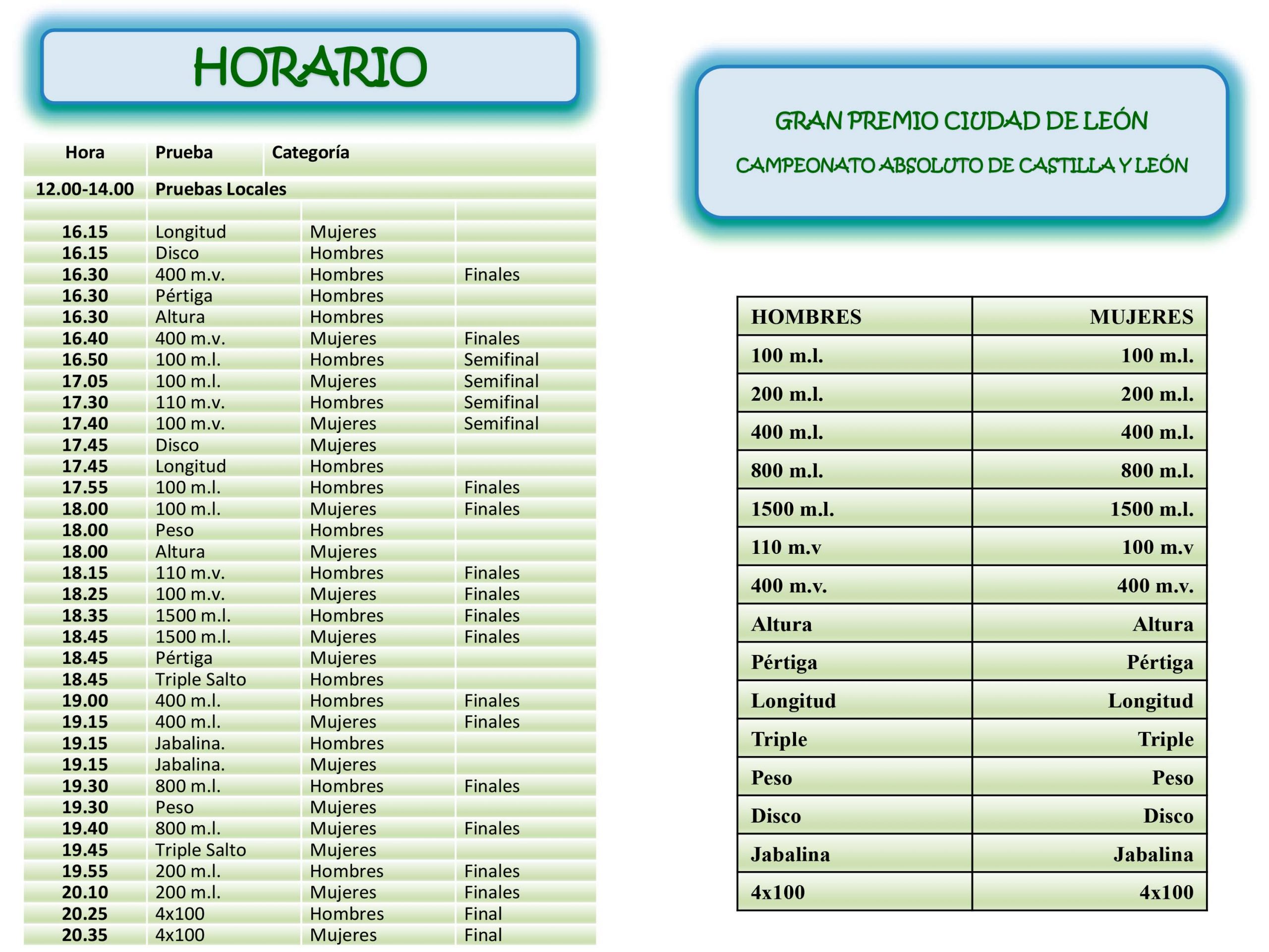 Las pruebas tendrán lugar el sábado, 28 de junio de 2025, a partir de las 16:00 horas. A la vista de las inscripciones, el martes día 24 de junio a partir de las 21:00 horas se publicará el horario definitivo y la lista de inscritos en la web de la delegación www.leonatletismo.com