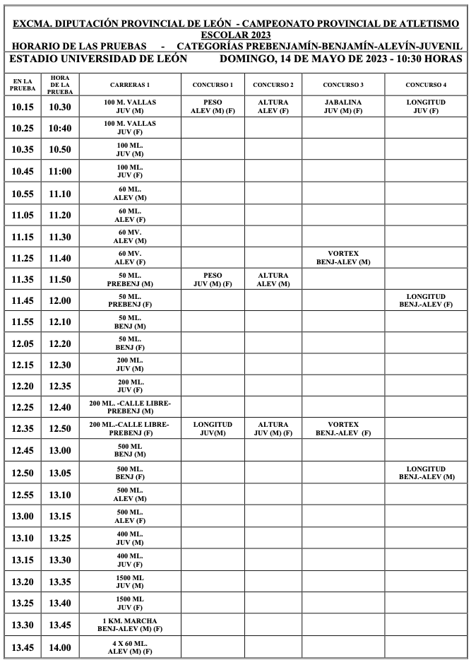 de mayo de 2023 desde las 10:30 en las Pistas de Atletismo de la Universidad de León se celebró el Campeonato Provincial de Atletismo Escolar Benjamín, alevín y juvenil. Organizado por la Delegación Leonesa de Atletismo  y La Diputación de León.