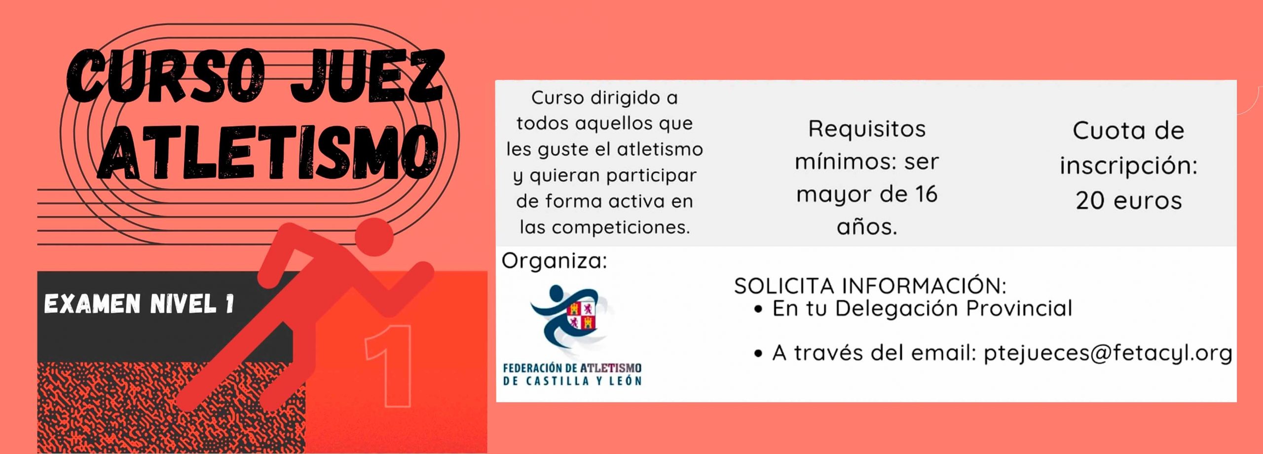 Curso dirigido a todos aquellos que les guste el atletismo y quieran participar de forma activa en las competiciones. Requisitos mínimos: ser mayor de 16 años. Cuota de inscripción: 20 euros. Organiza: Federación de Atletismo de Castilla y León. SOLICITA INFORMACIÓN: En tu Delegación Provincial A través del email: ptejueces@fetacyl.org