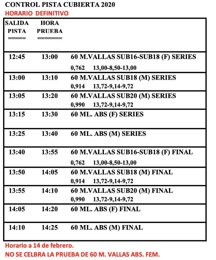 Control pista cubierta/aire libre 15 febrero (resultados)