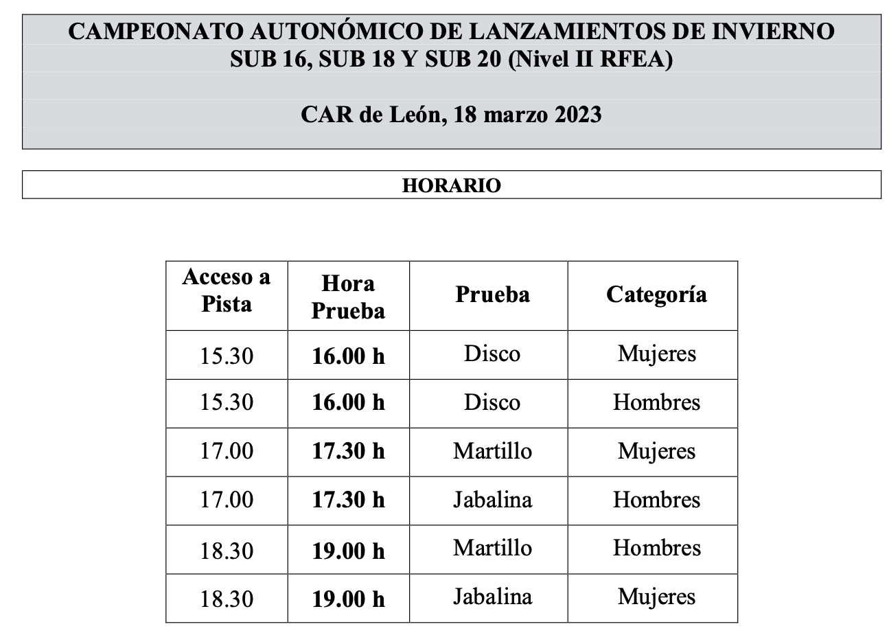 El sábado 18 de marzo de 2023 en las instalaciones del CAR de León se celebró el Cto. Autonómico de Lanzamientos Largos de Invierno Categorías Sub-16-18-20.