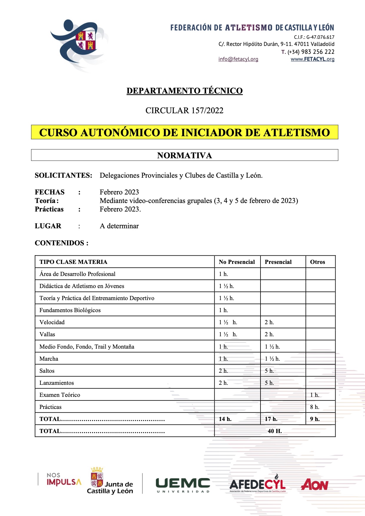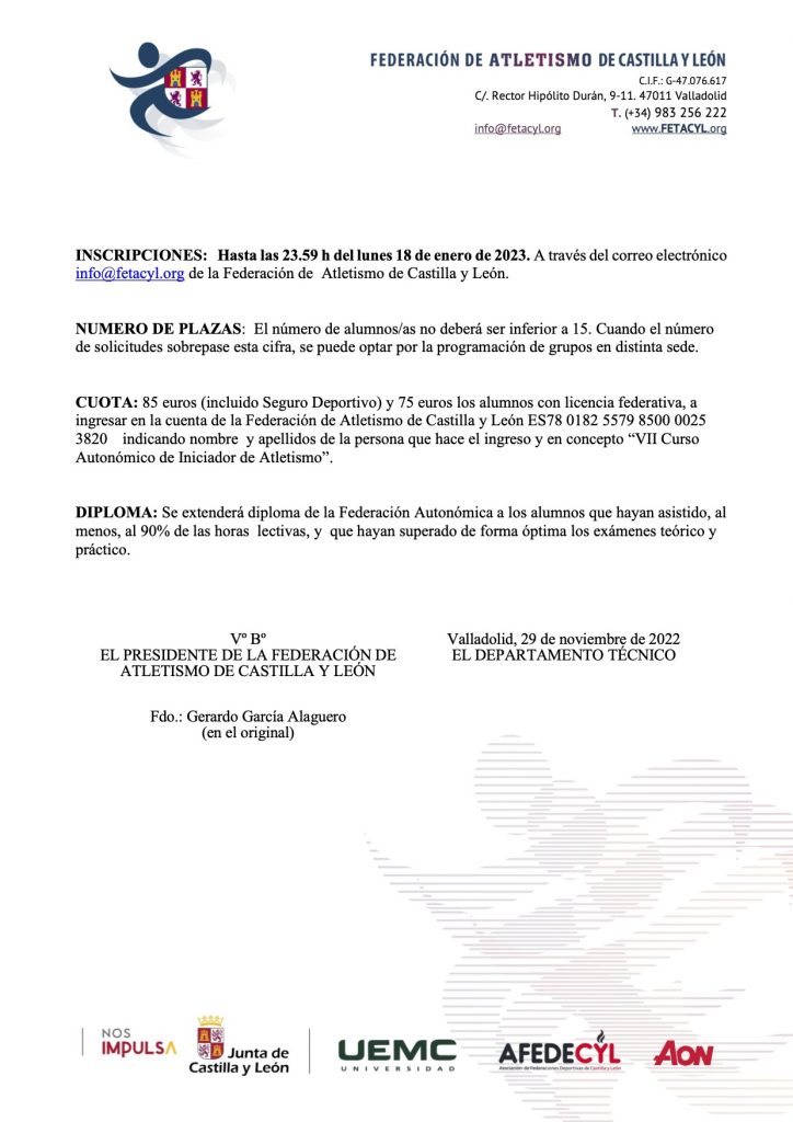 La Federación de Atletismo de Castilla y León organiza un curso semipresencial denominado: «Curso Autonómico de Iniciador de Atletismo». Seguidamente os dejamos toda la información de requisitos, precios, horarios,…