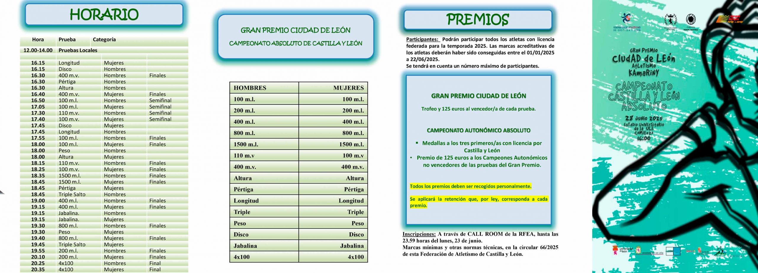 2º.- Las pruebas tendrán lugar en las instalaciones del Estadio Hispánico de León el sábado 19 de julio de 2025 a partir de las 11:00 horas. A la vista de las inscripciones, el jueves 17 de julio a partir de las 21 horas se publicará el horario definitivo en la web de la delegación www.leonatletismo.com
