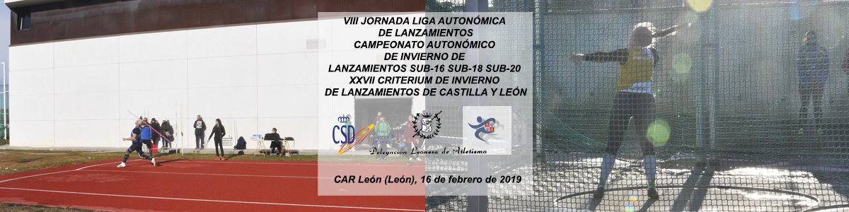 La Delegación de Atletismo de León, por delegación de la Federación de Atletismo de Castilla y León, organiza el XXVII Criterium de Invierno de Lanzamientos de Castilla y León, el 16 de febrero de 2019, en el CAR de León y se realizará también a la vez la VIII Jornada Liga Autonómica de Lanzamientos y el Campeonato Autonómico de Invierno de Lanzamientos sub-16 sub-18 sub-20