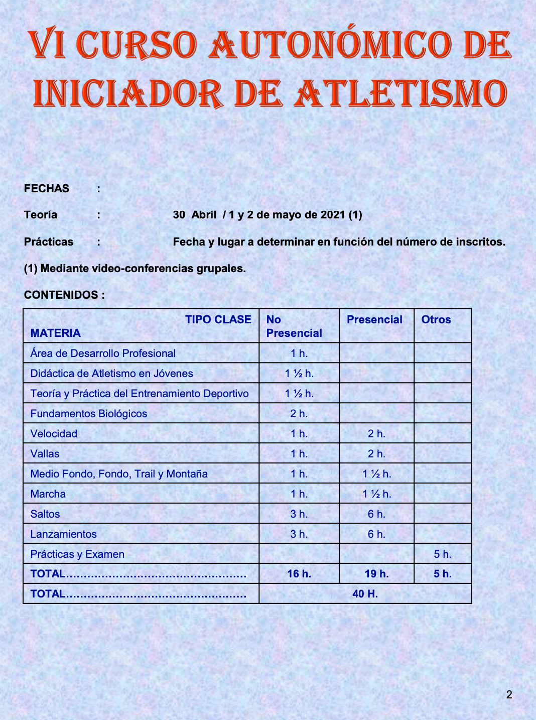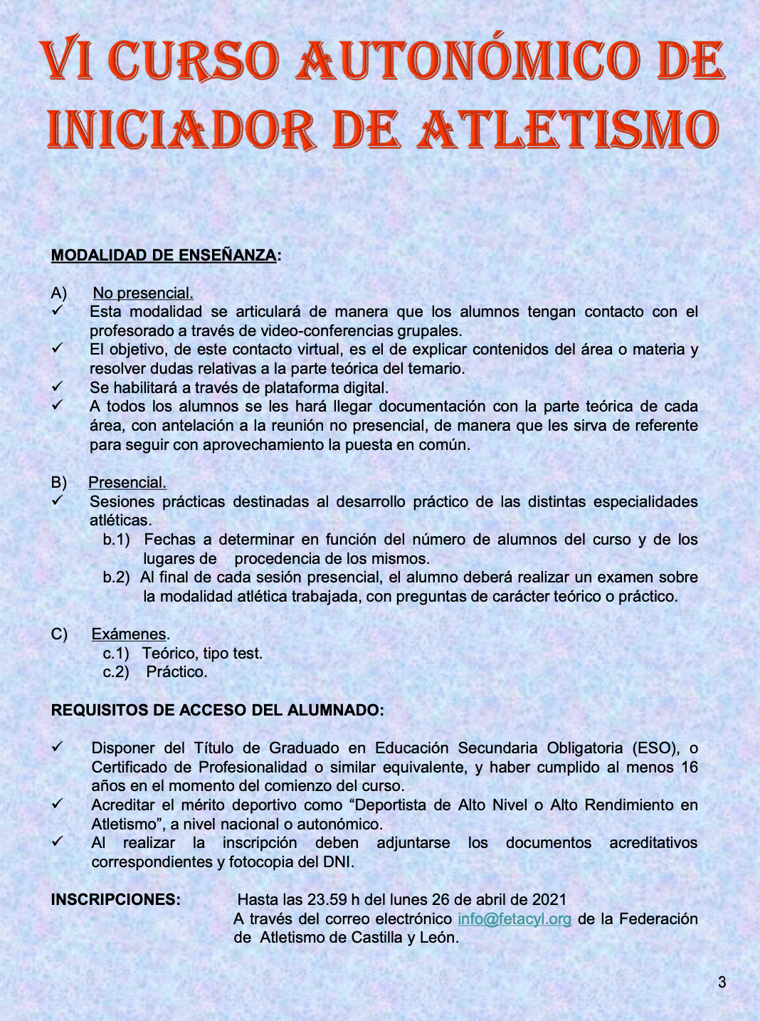 Durante los meses de abril y mayo se realizará el VI curso autonómico iniciador de atletismo con la modalidad presencial y no presencial (telemática) realizado por la Federación de atletismo de Castilla y León.